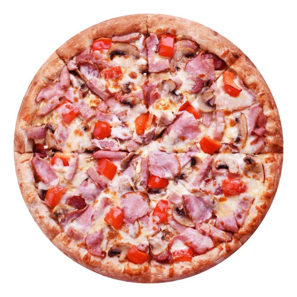 Свиной окорок, ветчина, грудка куриная копченая, охотничьи колбаски, грибы шампиньоны, болгарский перец, соус «Бургер», сыр «Моцарелла».