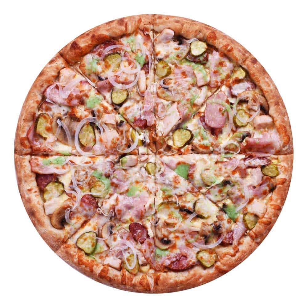 Свиной окорок, грудка куриная копченая, грибы шампиньоны, охотничьи колбаски, маринованные корнишоны, маринованный лук, сыр «Моцарелла», соус «Ранч», сыр «Песто» зеленый.