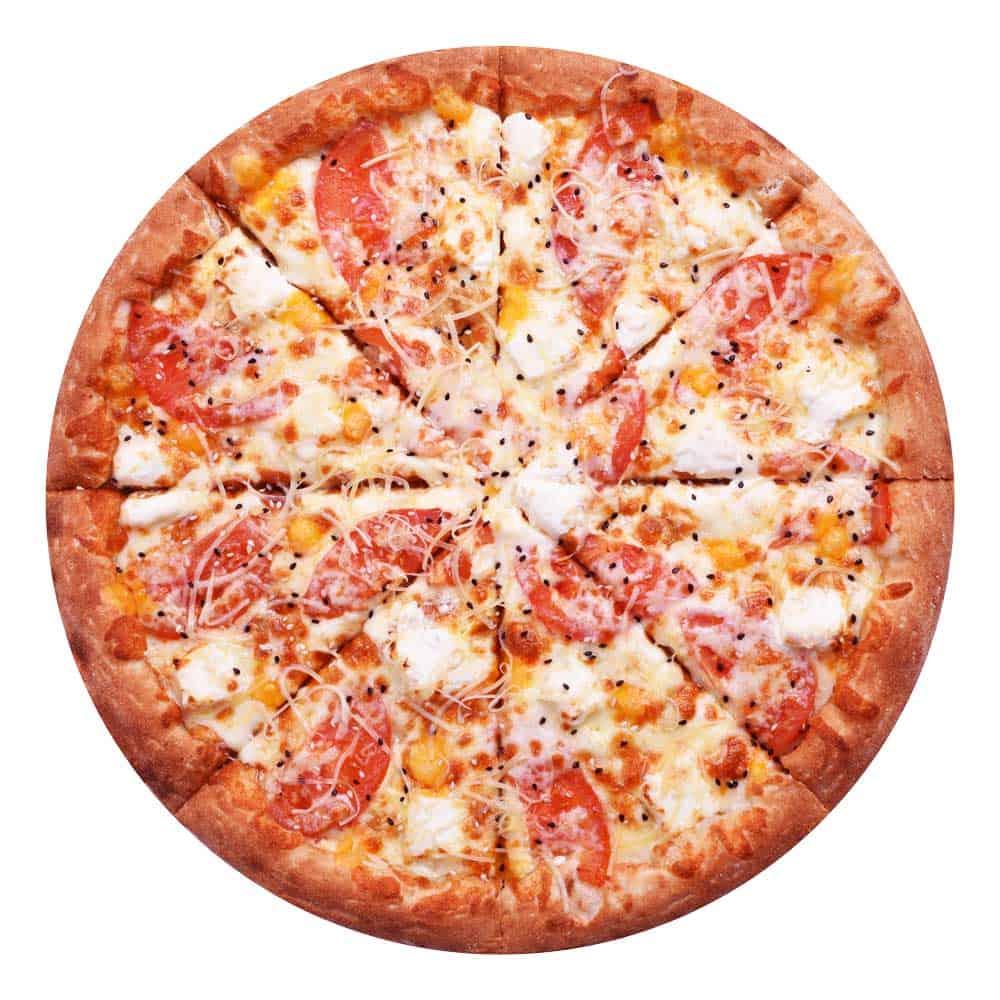Соус «Сливочно-сырный», кунжут, сыр «Пармезан», сыр «Моцарелла», сыр «Фета», томаты, сыр «Чеддер».