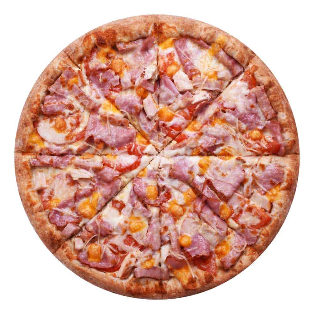 Свиная лопатка, копчёная куриная грудка, ветчина, томаты, соус «Ранч», сыр «Моцарелла», сыр «Чеддер», сыр «Пармезан».