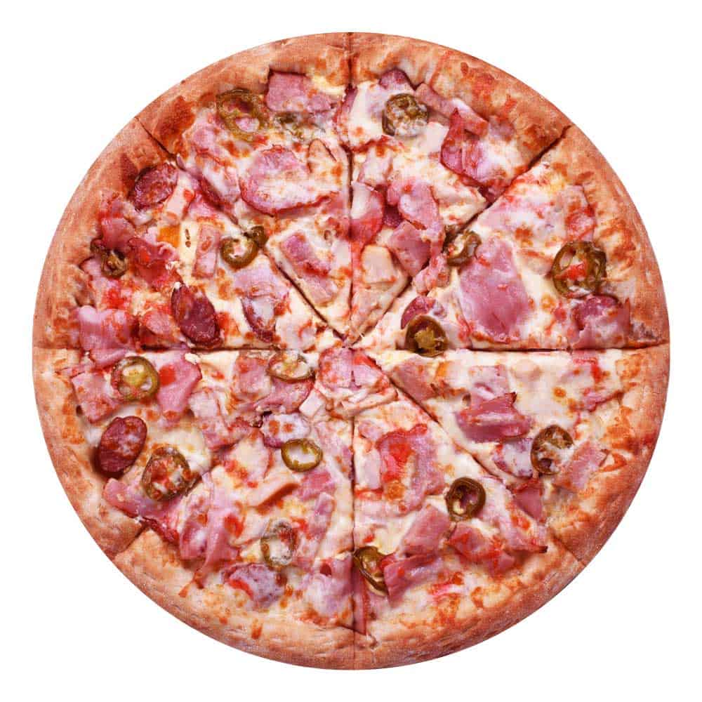Фирменный острый соус на основе пасты «Табаджан», перец халапеньо, копчёная куриная грудка, колбаски кабаносси, ветчина, сыр «Моцарелла», сыр «Песто» красный.